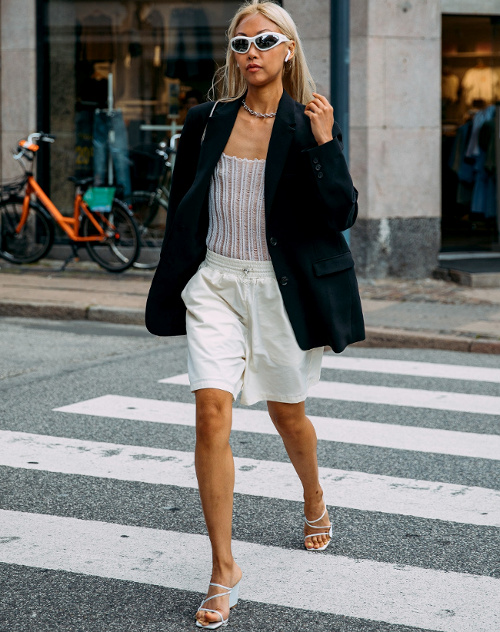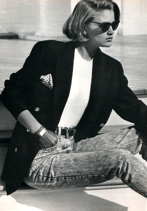 Années 80 : Le blazer noir apporte une caution working girl au jean. Il se veut relativement large, chicise les tee-shirts blancs et ne ne dit pas à non à une paire de lunettes de soleil noires (Zena Jeans 1987). 2021 : Il continue à se télescoper à des pièces bien plus désinvoltes que les composantes d'un costume 3 pièces. Il laisse cependant le jean javellisé à Punky Brewster afin de réchauffer le trio short long sportswear, top raffiné et fines sandales à talons (voir ici).