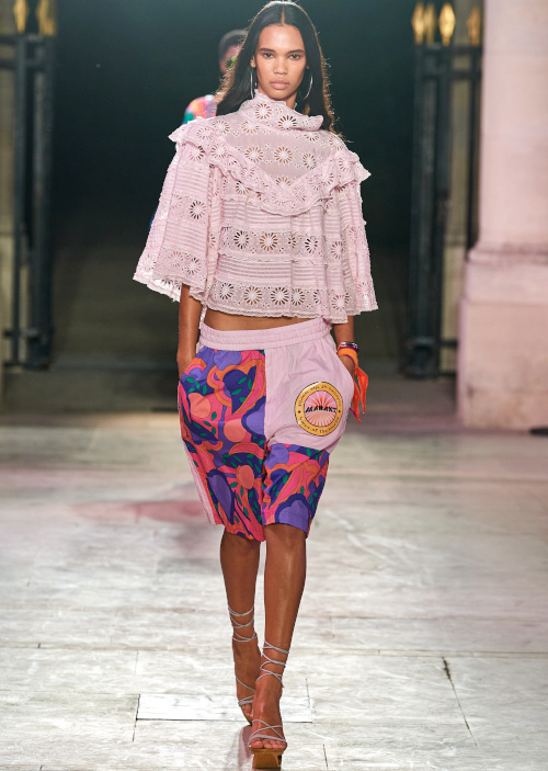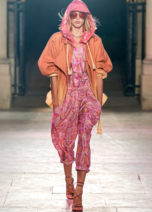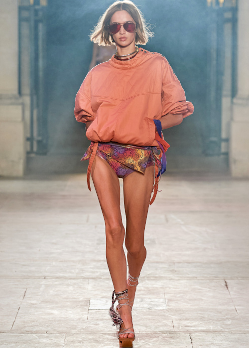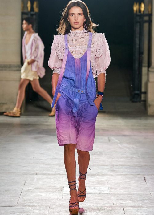 L'orange brûlé est reconduit pour l'été 2022 et c'est tant mieux : cette teinte à la fois solaire et chaleureuse a en effet le don de magnifier le bronzage, les bijoux dorés et les coloris tels que le violet, le chocolat, le bleu indigo, le vert émeraude ainsi que tous les délavages de denims (voir ici). Quoiqu'en dise la créatrice chouchoute des Parisiennes, la salopette bermuda est à réserver aux bambins de moins de 5 ans... (voir ici) Le rose gagne en vibrations bohèmes au contact d'un subtil tie and dye frangé (voir ici). Les télescopages de styles ont beau être plus que jamais dans l'air du temps, attention à ne pas mixer des pièces trop premier degré (voir ici). Celles reprenant les tubes de JLo devant leur miroir pourront peaufiner leur prestation en allant chercher leur costume de scène au 1 rue Jacob (voir ici). Isabel Westwood ou Vivienne Marant ? Quoi qu'il en soit, certaines silhouettes du défilé ne sont pas sans évoquer une version soft du travail de la créatrice punk. Mêlant glitter patiné, volume tomboy et dégaine nonchalante, les blousons du show font mouche (voir ici et là).