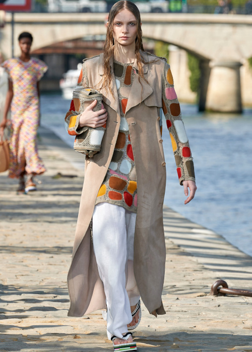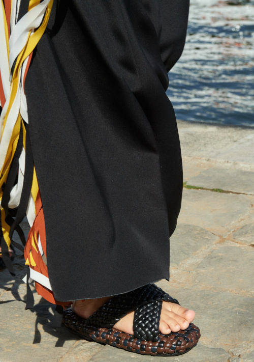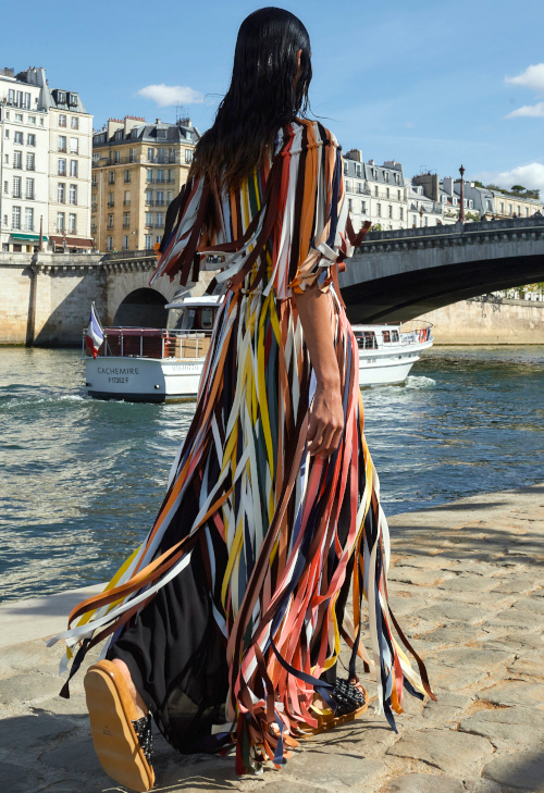 Gabriela Hearst traite ici les franges sur une tonalité minimaliste ; le résultat oscille entre pureté et manque d'allure (voir ici et là). Recycler des chutes de cuir est une chose, parvenir à en faire un vêtement désirable en est une autre... (voir ici) Les sandales créées à partir de tongs récupérées dans l'océan allient avec brio dégaine de caractère et conscience écologique (voir ici). L'inspiration "rideau de porte" laisse songeur... (voir ici)