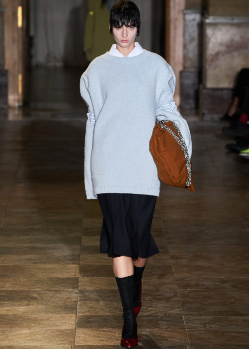Le créateur semble avoir eu à coeur de fournir à ses clientes fortunées de quoi se déguiser subtilement pour Halloween (manchette de bras en main de squelette). Ego trip ou astuce pour que les étiquettes arrêtent enfin de gratter dans le cou ? Quoi qu'il en soit, cette saison les étiquettes de Raf Simons se cousent sur le devant et à l'extérieur du vêtement (voir ici). Vous êtes-vous déjà demandé à quoi vous pourriez ressembler si d'aventure vous tentiez de retourner une crêpe en la faisant voltiger ? Raf Simons vous livre un début de réponse…