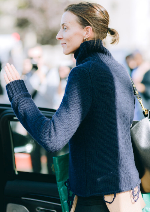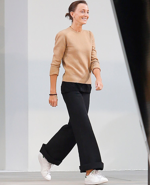 Avec ses pulls col rond, ses chinos tout terrain et ses baskets confortables, la créatrice britannique est l'incarnation de l'ADN de sa griffe, que l'on pourrait résumer en trois mots : confort, pragmatisme et durabilité. Et si l'on décèle au sein de ses collections un brin plus de fantaisie que dans ses propres uniformes, le lien entre les deux n'en demeure pas moins évident. Une évidence faite d'honnêteté et d'authenticité. En la voyant, on comprend où elle désire emmener ses clients. On sent également qu'elle ne fait pas semblant. Son travail apparaît comme une extension de ce qu'elle prône au quotidien.
