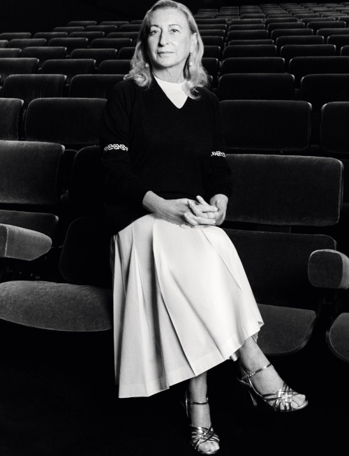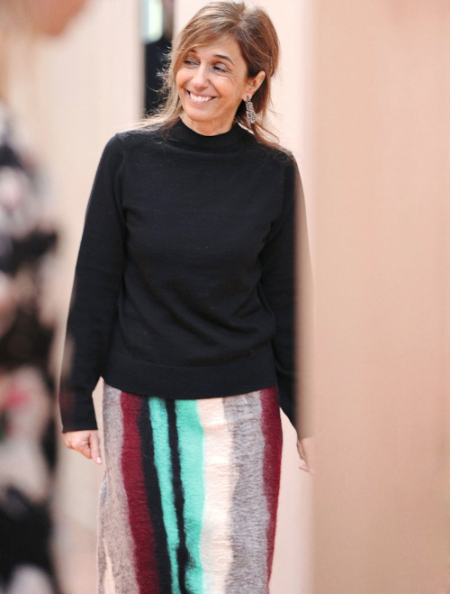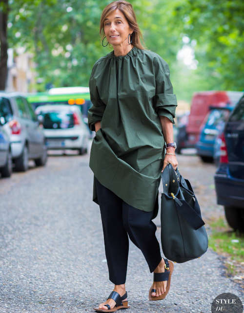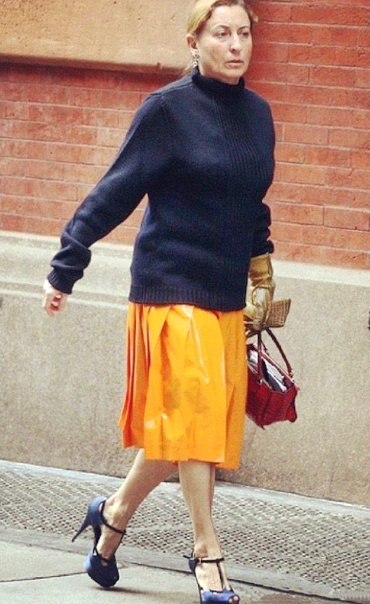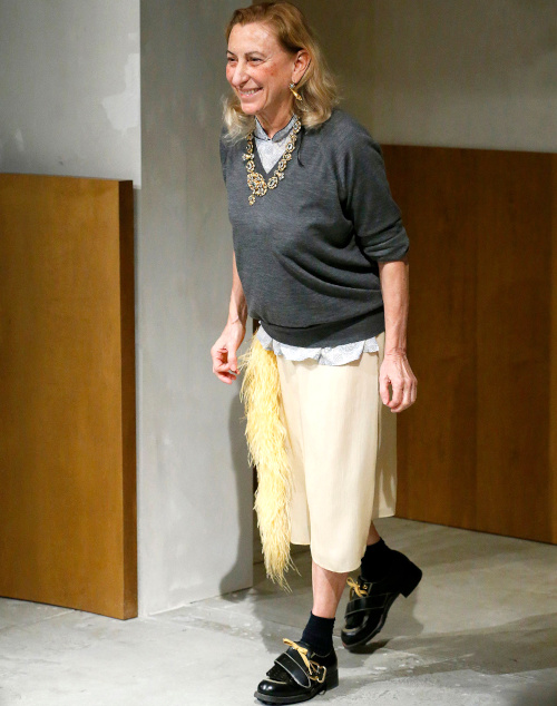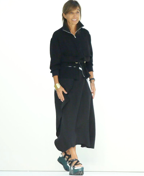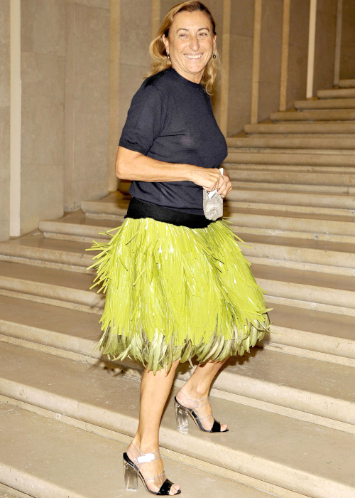 S'il lui a fallu quelques années pour définir son uniforme (voir ici), Miuccia Prada peut aujourd'hui se targuer d'avoir réussi à se composer une silhouette à la fois unique et identifiable. Celle qui travaille désormais en duo avec Raf Simons mise en effet régulièrement sur le duo jupe midi de caractère + top sobre (voire casual). Une base dont elle fait varier les détails en fonction de la tonalité de ses collections (voir ici, ici, ici, ici et là). On lui envie la tranquillité d'esprit que doit apporter la découverte de son équation stylistique parfaite...