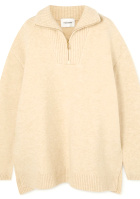 On joue ici sur l'opposition jean ultra moulant/maille oversize. On optera pour un chignon haut avec un ou plusieurs chouchous. Un ample manteau kaki pourra venir réchauffer l'ensemble.