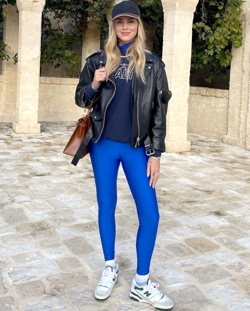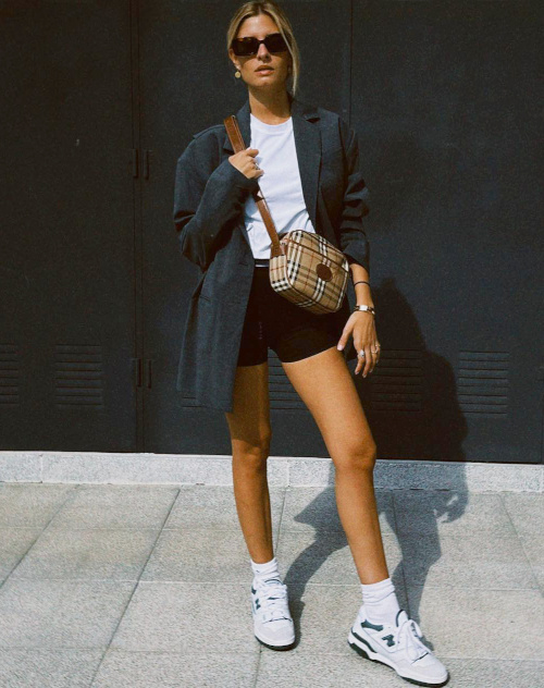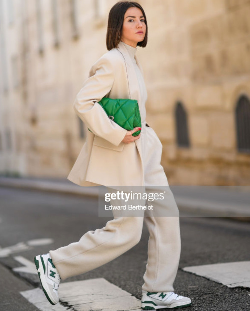 De Pernille Teisbaek à Alexandra Pereira en passant par Chiara Ferragni, nombreuses sont celles qui adoptent la 550 afin de la mixer à des pièces sportswear telles que le jogging ou le short cycliste (voir ici et là). On évitera cependant de leur emboîter le pas : afin de rester dignes en milieu urbain, les baskets se doivent de flirter avec des éléments n'appartenant pas à leur famille stylistique. On pensera ainsi à les marier à un accompagné d'un , à un pantalon large masculin, à une mini robe fleurie réchauffée au creux d'une grosse laine, au mix short en jean/blazer, à une robe-pull midi ou encore - pourquoi pas - à une paire de leggings en laine côtelée.