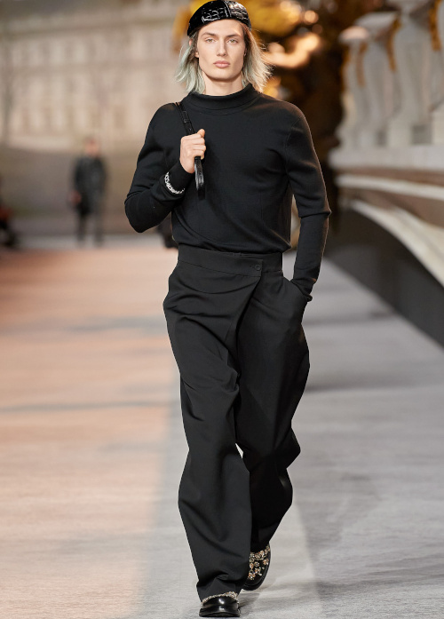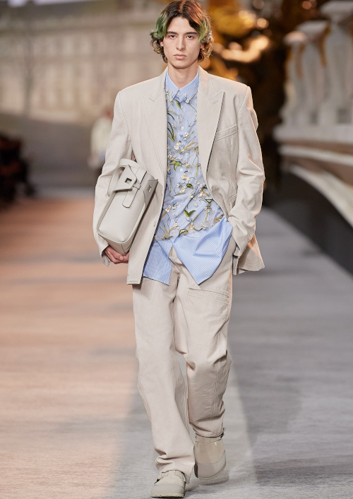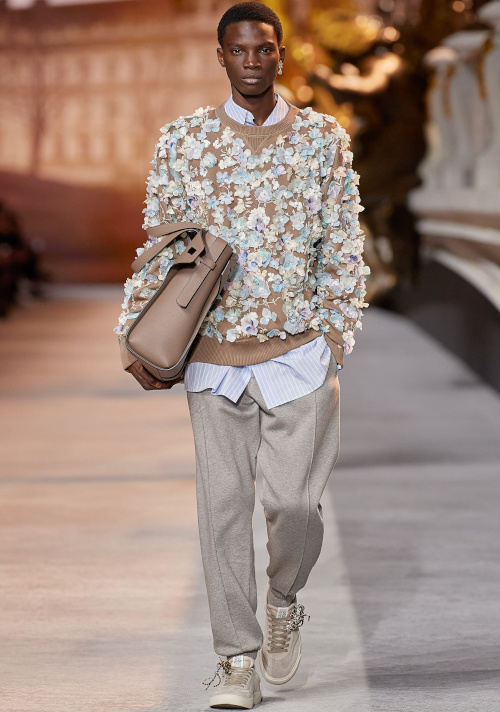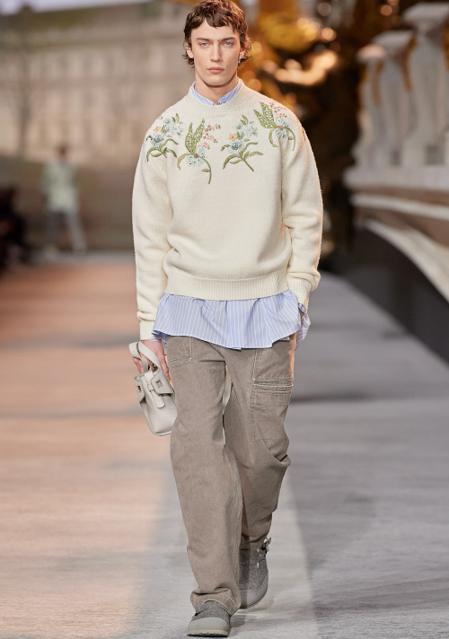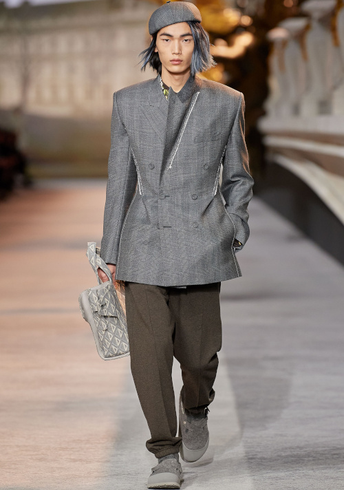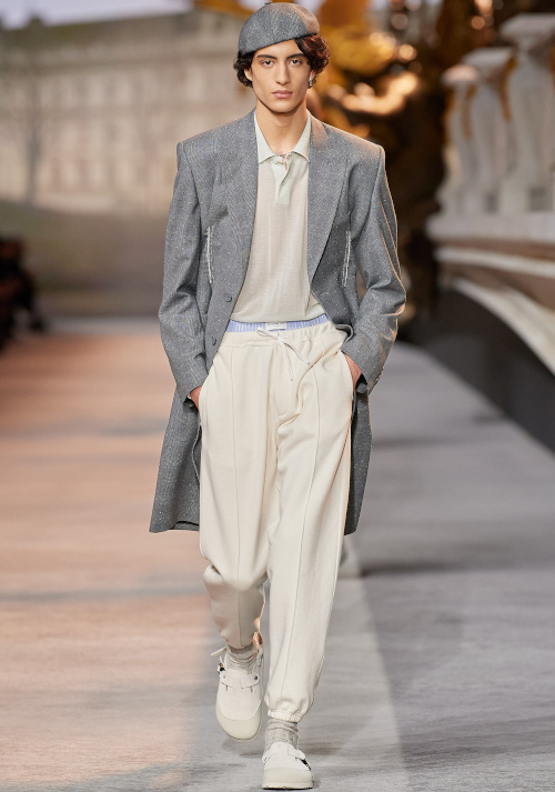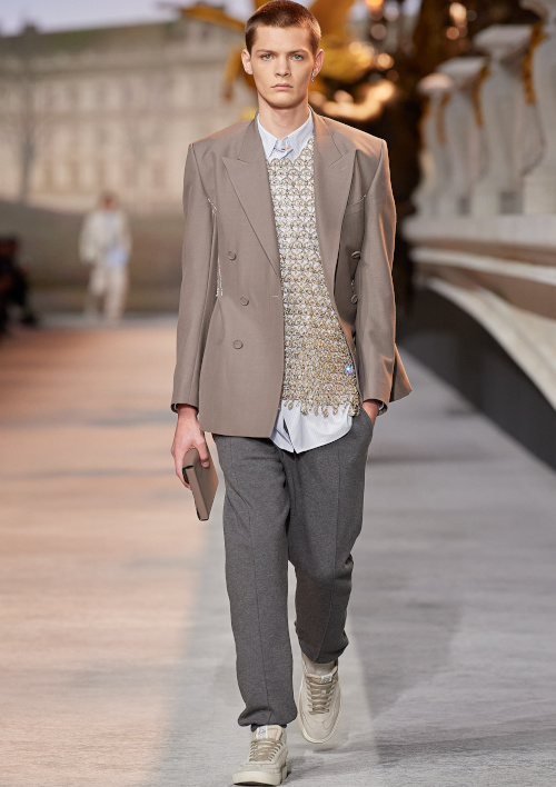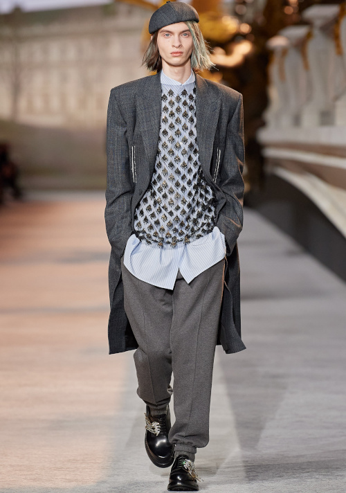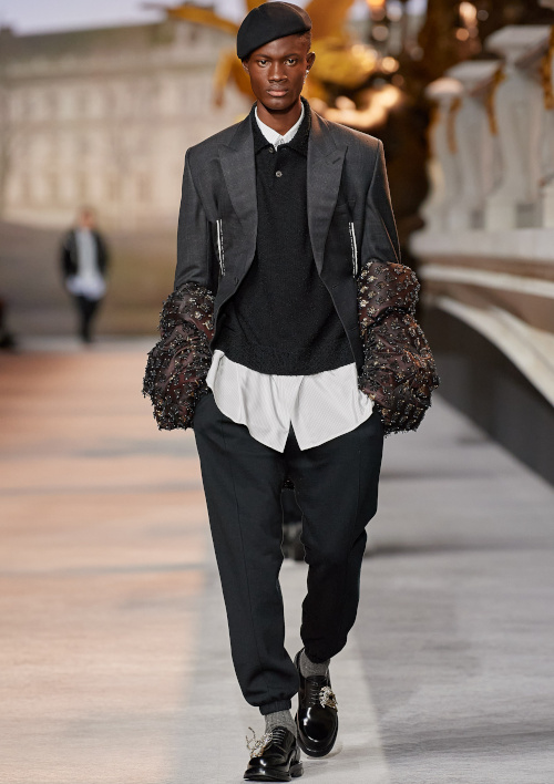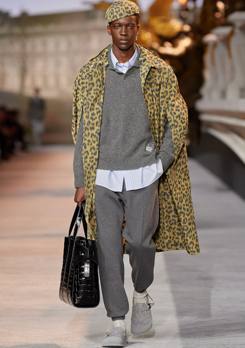 La cape imprimée léopard se révèle très efficace pour sophistiquer l'ensemble monochrome pull-over/jogging en molleton (Dior). Faux boosteur d'allure, le blazer oversize gagnera à se voir cintré au moyen de pinces bien placées afin de muer en veste Bar. Et peu importe si les coutures se voient ; c'est d'ailleurs ainsi que Kim Jones recommande de les arborer (Dior). Celles pouvant se permettre une folie griffée auront tout intérêt à se ruer sur le blazer drapé du show Dior Homme. Intemporel, élégant, polymorphe et audacieux, ce dernier atteint en effet la perfection que l'on attend d'une pièce issue d'une grande maison française. Celles qui - après s'être ruinées en autotests - boycottent l'avenue Montaigne pourront quant à elles se contenter d'associer blazer gris chic et pantalon cargo (Dior). En matière de télescopages stylistiques, le mix pantalon utilitaire + gros pull délicatement brodé (ou sweat piqué de fleurs 3D) est à décliner à l'envi ! La taille décalée reste une manière discrète mais impactante de twister la dégaine d'un pantalon. À consommer donc sans modération ! (Dior) On pensera à aller s'offrir un mètre ou deux d'organza brodé au Marché Saint-Pierre afin de se confectionner un ample débardeur que l'on superposera à nos chemises les plus masculines (voir ici, ici et là - Dior). Afin de pouvoir porter le jogging en ville sans rougir, on le choisit un brin rigide et pourvu d'une couture centrale lui injectant de la tenue (Dior). Le retour de la taille basse étant bel et bien acté, il est préférable de miser sur l'effet "trompe-l'oeil" en laissant dépasser un boxer d'un pantalon normal plutôt que d'opter pour une véritable taille basse dévoilant de manière mécanique une partie trop importante de nos dessous (Dior).
