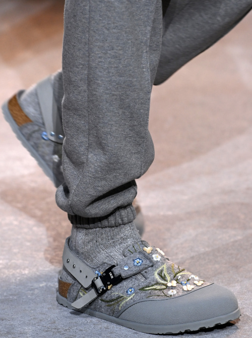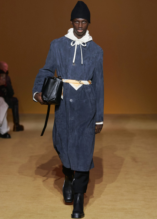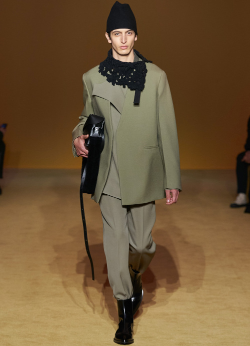 Plus le manteau sera bien coupé, englobant et intemporellement chic, plus le port du jogging deviendra envisageable (Dior). On laissera - sans aucun regret - aux hommes Dior leurs Birk' en feutrine brodée (voir ici). Aplat marron et touches violettes font décidément bon ménage ! (Louis Vuitton) Si l'on décide de porter en ville un ensemble de jogging, le port d'un pardessus infiniment élégant s'impose (Études). Piqués de touches de noir intense, les camaïeux de vert lichen gagnent en épure ce qu'ils perdent en dimension militaire. À reproduire ! (Jil Sander) On pensera à ceinturer nos pardessus un brin amples et à glisser nos bas de pantalons dans nos bottines (Jil Sander). Relevés d'un éclat de vert mousse, les gris clairs et autres faux blancs distillent une aura organique/chic ne manquant pas d'attrait (Jil Sander). Un joli noeud cocarde réalisé avec les cordons d'un sweat à capuche viendra subtilement contredire la nature sportswear de ce dernier. Un gimmick dont on aurait tort de ne pas abuser ! (Jil Sander)