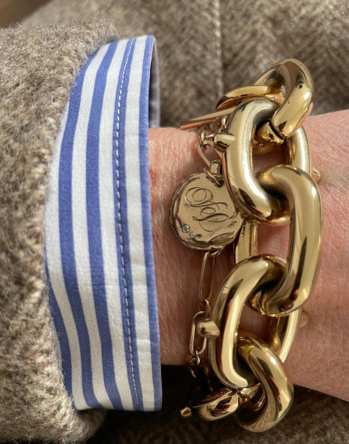 Tellement subtil que... ben voilà, chemise à rayures, duffle beige, blazer beige... et...chemise au col subtil qui casse en toute subtilité le classicisme beigeasse de l'ensemble.