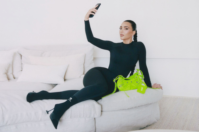 Apparemment désireux de toucher également sa clientèle parisienne, Demna Gvasalia invita pour la seconde fois Isabelle Huppert au sein de sa campagne "galerie de portraits" . Un choix qui - si l'on en juge par les clichés lui étant consacrés - n'est pas parvenu à faire pétiller les zygomatiques de l'actrice. Incarnant le stéréotype de la bourgeoise déprimée au snobisme assumé, cette dernière renvoie en effet une image à la fois froidement hautaine et glacialement désabusée (voir ici et là). Or, si ce genre de personnage peuplant la monde de la mode pouvait faire fantasmer il y a encore quelques années de cela, ce n'est plus le cas aujourd'hui. En cette période où le sourire d'autrui est devenu une denrée rare, offrir des visuels aux mines délibérément lugubres évoquant l'humeur d'un héros houellebecquien manque cruellement d'élégance. On notera que les photos ont été prises aux domiciles des égéries. Un signe du temps... Après deux ans de pandémie, de quarantaines et de confinements, la maison est en effet devenue un véritable prolongement des individus. On la pense pour être entraperçue sur Zoom, pour flatter la carnation lors de ses prises de selfies (ou ses Stories vidéo) ou encore pour générer des "likes". Sans parler de la nouvelle tendance "homecare" (ou "ménage chic" ou encore "soin de la maison") qui incite à la considérer comme une entité propre dont les produits d'entretien se confondent avec de véritables produits de beauté. Sac baguette de forme arrondie, Le Cagole confirme la montée en puissance des années 2000 au sein de l'imaginaire des designers. Il suffit en effet de jeter un oeil au petit dernier de Balenciaga pour se retrouver instantanément projeté au sein de la garde-robe de Paris Hilton période "The Simple Life"... On regrette par ailleurs qu'en revendiquant être une version revisitée du Classic First de la griffe, le Cagole galvaude l'une des pièces phares de l'héritage Ghesquière. Photographiée ici en train de prendre un selfie tout en regardant l'objectif de la caméra, Kim Kardashian n'en finit pas de redéfinir les codes d'une pratique qu'elle a elle-même contribué à populariser. À l'instar des professionnelles de la pose miroir qui tentent actuellement de renouveler l'art déjà daté du selfie (on pense tout particulièrement aux "selfies immobiles filmés" de Sophie Fontanel).