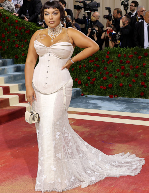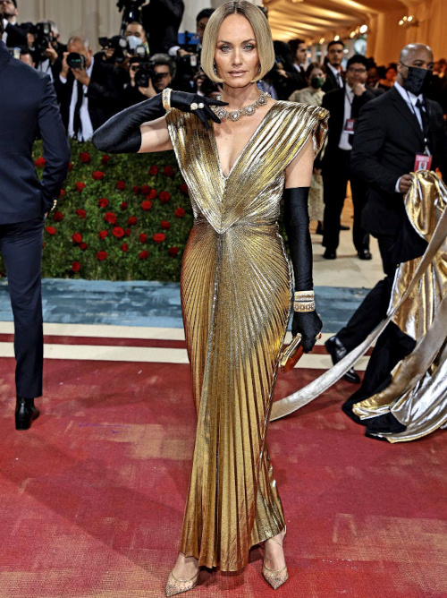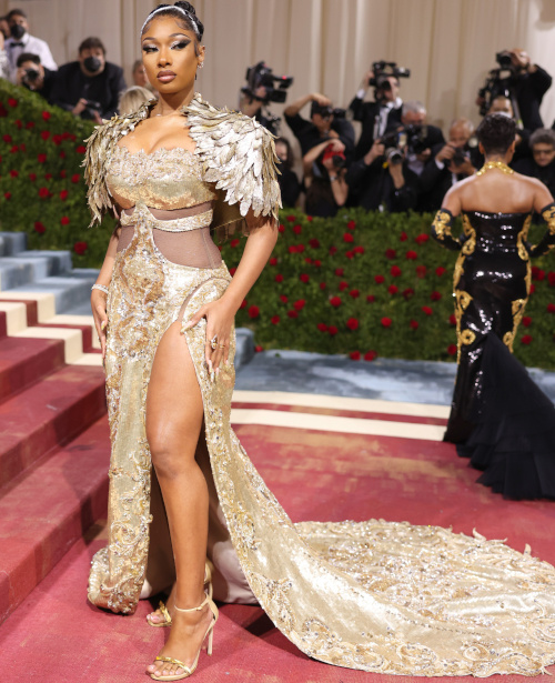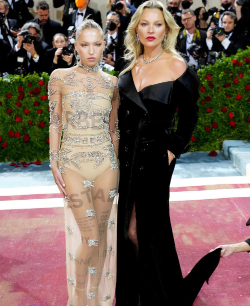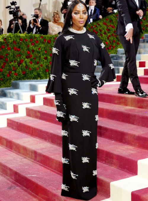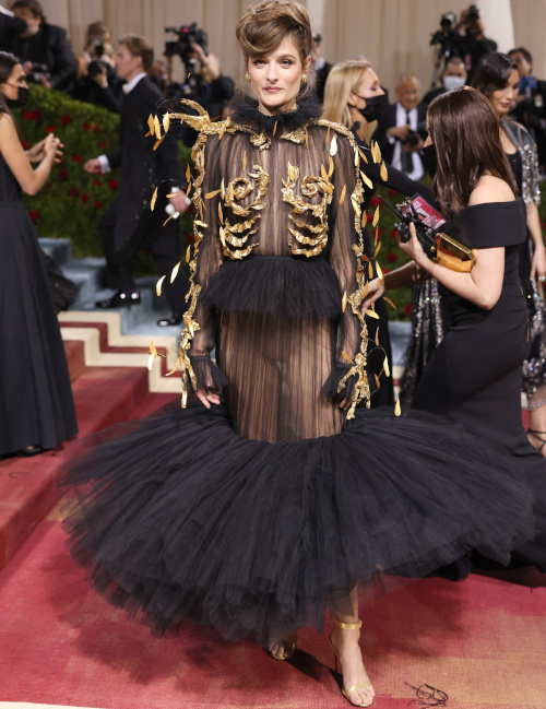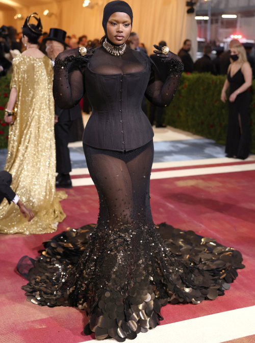 Souhaitant coller au plus près du thème de la soirée, nombreuses furent celles qui se laissèrent séduire par des atours aux reflets 24 carats. Et si Sara Sampaio tira joliment son épingle du jeu en misant sur un fourreau Michael Kors aussi chic que sensuel, on regrette qu'Amber Valletta ait cherché à faire écho à la dimension graphique de sa robe vintage Azzaro en adoptant un carré sévère et une gestuelle anguleuse rendant son allure générale un brin rigide, mais aussi que Rachel Brosnahan (en Joseph Altuzarra) et Megan Thee Stallion (en Moschino) aient pensé que la teinte préférée du roi Midas se devait - pour espérer briller - d'être associée a des effets matières et autres découpes alambiquées. Tenter - en un temps record - de rendre photogénique la traîne des invitées n'a pas dû être de tout repos… (Jodie Turner-Smith en Gucci, Shalom Harlow en Ralph Lauren). En revendiquant avoir volontairement perdu 7 kilos en 3 semaines afin de pouvoir se glisser dans la robe de Marylin Monroe, Kim Kardashian laisse une nouvelle fois ses obsessions fashion prendre le pas sur le bien-être de son corps (on se souvient notamment de sa tenue en scotch qui ne lui permettait que très peu de mouvements). Une attitude qui, si elle s'avère complètement raccord avec l'usage du corset cher au fameux "gilded age" américain, n'en dénote pas moins avec l'actuelle philosophie "body positive"... On regrette que le turban accompagnant la tenue Gucci de Jessica Chastain ne fut pas mieux disposé (voir ici). Positionné légèrement plus haut sur le front, il aurait permis de dégager le visage et d'alléger visuellement l'ensemble de la silhouette. Bella Hadid semble avoir confondu le bal du Met avec le salon des jeux vidéos celtiques à tendance SM (voir ici). Blake Lively offrit ses lettres de noblesse au concept de la robe 2 en 1 ! (avant/après) Les extensions capillaires de Kaia Gerber n'ont rien à envier à celles des poupées "Dame Boucleline et les Minicouettes" de notre enfance. L'intensité des ondes positives émanant du couple mère/fille Moss faillit générer des arcs-en-ciel spontanés (voir ici). Si porter des collants avec une paire de sandales n'est guère conseillé dans la vie de tous les jours, que dire lorsqu'il s'agit de poser sur un tapis rouge… (voir ici) Difficile en voyant Billie Eilish poser devant les photographes de savoir si celle-ci était indisposée intestinalement ou si elle entamait la phase 1 du processus de catalepsie… Faire de son épiderme une matière à part entière semble être la nouvelle lubie du moment (Nicki Minaj en Burberry, Cara Delevingne en Dior Haute Couture).