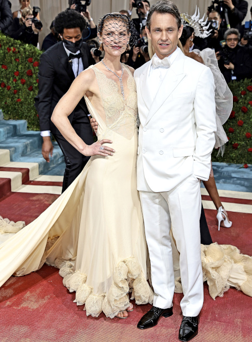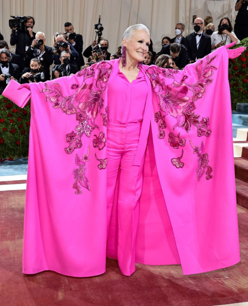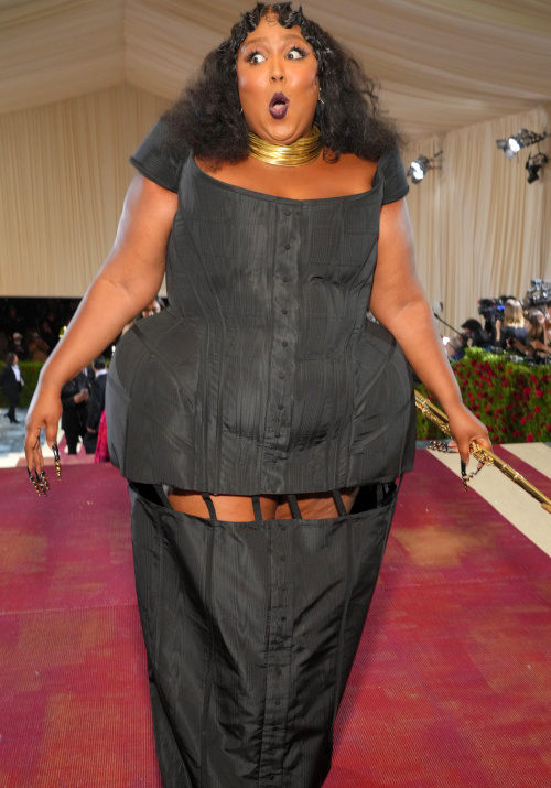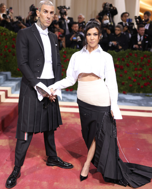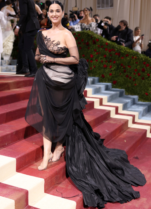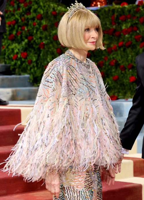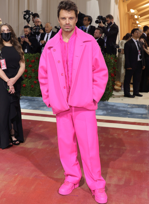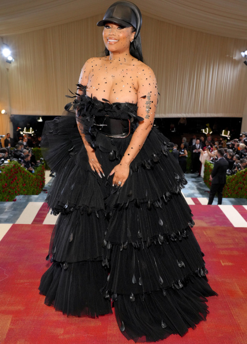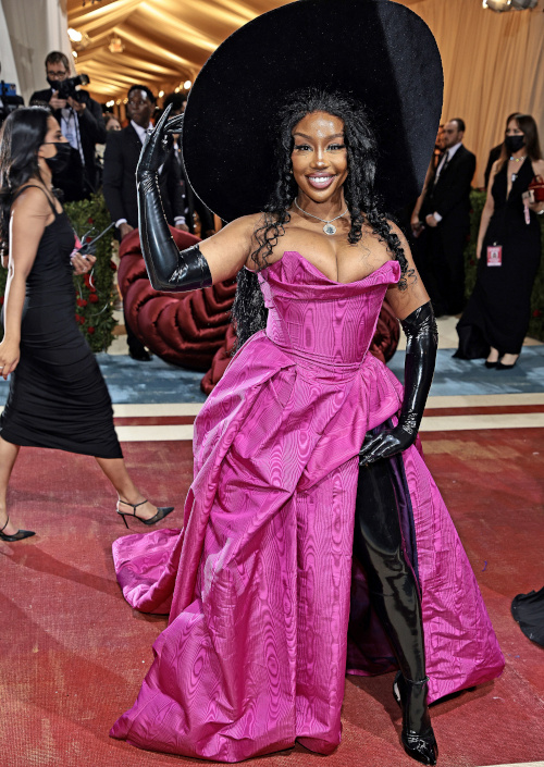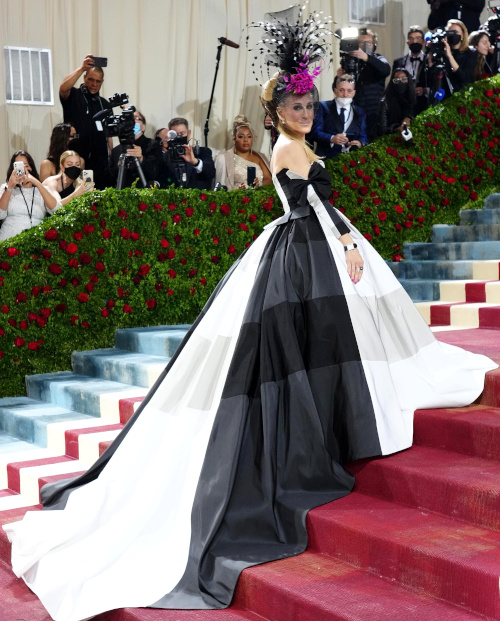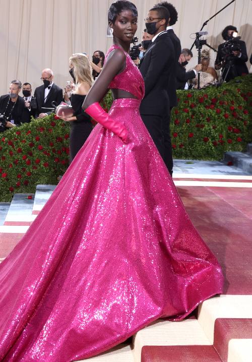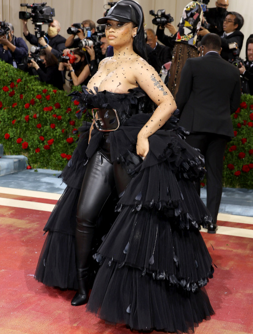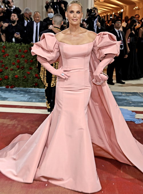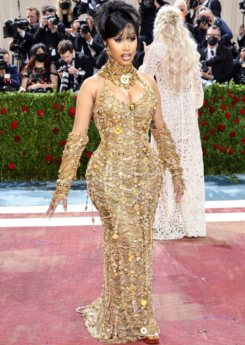 Qu'il s'agisse d'un clin d'oeil au futur film Barbie, d'un désir viscéral de voire la vie sous un jour optimiste ou d'un hommage au rose shocking de Schiaparelli, force est de constater que le total look rose fut plébiscité par bon nombre d'invitées… (voir ici, ici, ici, ici et là) Nicolas Ghesquière mit un point d'honneur à ce que les toilettes Louis Vuitton arborées lors de la soirée soient des modèles déjà portés ou issus des archives de la maison. Un positionnement éco friendly certes intéressant, mais qui n'en mit pas moins en exergue le manque chronique d'évidence stylistique de ses créations (voir ici, ici, ici et là). Entre premier degré (voir ici et là), vibrations gothiques grinçantes, humour grotesque et SF de série B, le corset - pièce forte du dress code du 19ème siècle - ne génère en nous aucune nostalgie. Certains décolletés semblent avoir été conçus pour offrir à leur détentrice la possibilité de relancer un "Nipplegate" (voir ici, ici et là). Anna Wintour se verrait apparemment bien succéder à la reine d'Angleterre… (voir ici) Miranda Kerr décida de ne prendre aucun risque, ce qui au vu des tenues de ses consoeurs était probablement un choix judicieux… (voir ici) Les longs gants donnant l'impression d'avoir été découpés dans une paire de bas d'Ida - la grand-mère acariâtre de la série "Malcom in the Middle" - ne s'avèrent pas des plus flatteurs. Au vu des sublimes cachettes qu'offrait le volume de certaines toilettes, il est dommage que les invitées ne soient pas venus accompagnées de leur progéniture en âge d'apprécier une bonne partie de cache-cache (Kendall Jenner en Prada, Kylie Jenner en Off-White, Sarah Jessica Parker en Christopher John Rogers). Cardi B fit une fois de plus preuve d'élégance et de subtilité (Versace).