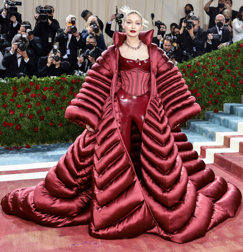Je trouve toujours très drôle le lâchage du MET avec son thème imposé, on sait qu'il y aura du grand n'importe quoi , car il me semble que les carrières ne sont pas en jeu . Du coup j'aime beaucoup voir de longues robes de princesse , le manteau de Gigi Hadid en doudoune satin, les plumes ... et le côté carnavalesque de sa sur? incroyable! quand on voit ce qu'elle est capable de porter sur les podiums et ce déguisement??!