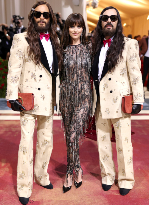 Les bouillonnés chers au 19e siècle ont perdu en chemin leur élégance (Katy Perry en Oscar de la Renta). Avec son fourreau rose pâle aux manches bouffantes, Molly Sims aurait pu incarner sans mal l'une des protagonistes du roman "Les Cygnes de la Cinquième Avenue". L'évolution physique de Khloé Kardashian se révèle assez fascinante… (voir ici) Le jaune verdâtre des toilettes de Gwen Stefani et de Huma Abedin pourrait bien s'avérer être le meilleur des coupe-faims (à conserver en photo dans son iPhone lorsqu'on envisagera d'entamer notre deuxième tablette de Milka Oreo). On regrette que Lucy Bonton ait jeté son dévolu sur une robe dont l'empiècement top/jupe crée un effet "absence de taille" peu flatteur (voir ici). Avoir l'impression d'avoir bu une bouteille de whisky à jeun tout en sachant pertinemment que l'on carbure au Coca Zéro : tel est le genre d'effet que peut provoquer la robe de Chloé Bailey. Les looks signés Burberry brillèrent par leur morosité, leur manque d'élégance et leur absence de lien avec le thème de la soirée. Les liens entre l'acteur Jared Leto et le DA de Gucci semblent s'intensifier (voir ici). Les carnations les plus pâles gagneraient à éviter le jaune ultra dilué (voir ici). Le concept de déconstruction du vêtement a ses limites… (voir ici) Au jeu des transparences et des étoffes translucides, certaines - voir ici et là - s'en sont mieux sorties que d'autres… (voir ici et là) On garde à l'esprit que les photos prises de manière professionnelle font rarement totalement écho à la réalité… (voir ici, ici, ici et là) Le sourcil bleaché (voir ici et là), bientôt tendance ? Réponse dans quelques mois…
