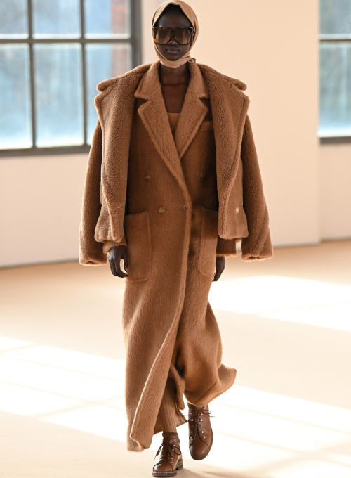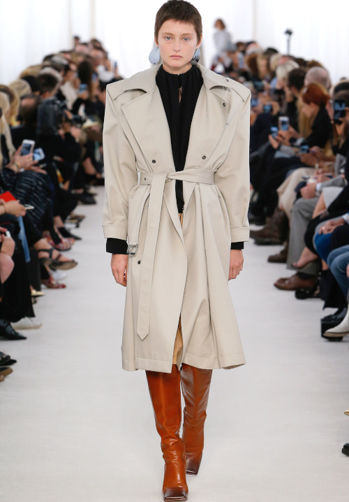 Les digressions du créateur autour du trench semblent s'inspirer aussi bien de la carrure du modèle porté par la reine que des fentes permettant une gestuelle plus facile.