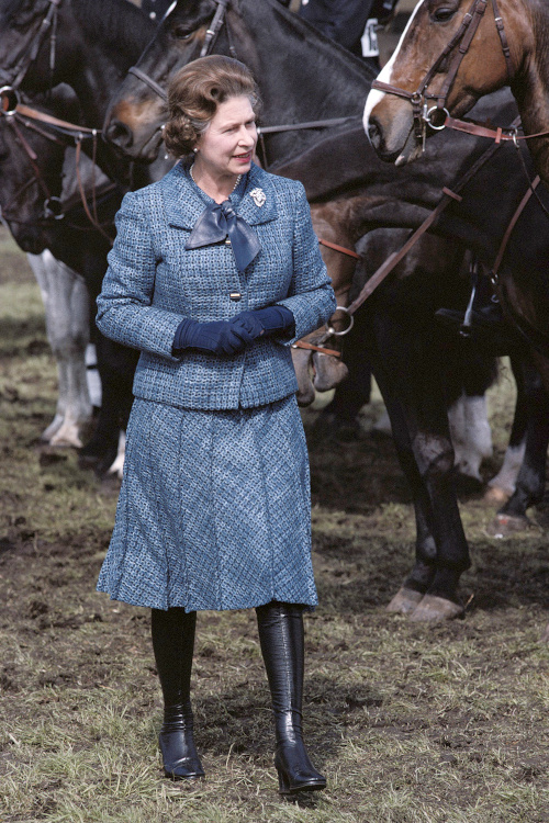 Le combo foulard/veste verte matelassée/jupe en tweed est l'un des looks illustrant le mieux - dans l'imaginaire collectif - le style "outdoor" de la reine.