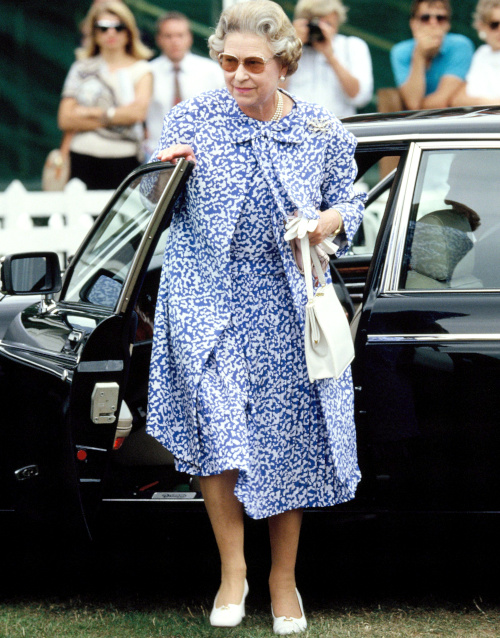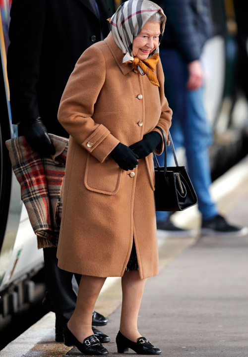 Comme à son habitude, la reine protège son indéfrisable via un foulard noué sous le menton. Ce jour-là, elle opte pour un modèle bordé de rose.