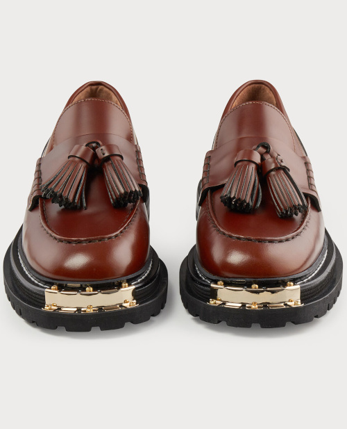 Cette saison, ce sont indéniablement qui reviennent le plus dans mes propositions de tenues. En voici les principales raisons : Les détails classiques du mocassin sont bien présents et permettent ainsi d'ancrer la chaussure dans l'histoire de la mode. Plus imposant que d'ordinaire, le volume des pampilles confère une dimension espiègle à l'ensemble. La teinte caramel du mocassin offre plus de possibilités de combos chromatiques que le traditionnel noir. Clin d'oeil à celles des Doc Martens, les surpiqûres ne manquent pas de caractère. Le bout métallique doré confère une force symbolique aux souliers (et à celle qui les chausse). Épaisse de 5 cm, la semelle crantée évite l'effet tassant des semelles fines des mocassins classiques.