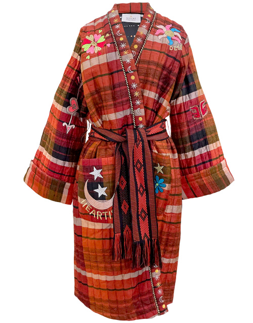 Ayant envie depuis longtemps d'un vêtement doudou de caractère susceptible de déclencher en moi une décharge de bonne humeur (aussi bien à sa vue qu'à son toucher), je ne pouvais que tomber amoureuse de ce kimono/peignoir d'intérieur/extérieur. À la fois chaleureux, espiègle et versatile, je l'imagine parfaitement réchauffer au long cours mon duo fétiche jean/tee-shirt.