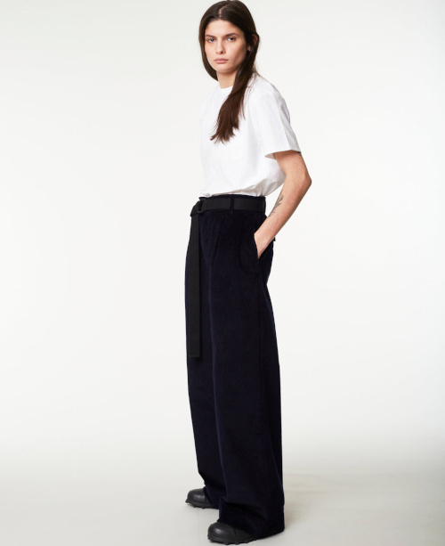 Suffisamment long pour se casser généreusement sur la chaussure (sans pour autant traîner exagérément sur le sol), coupé dans un velours finement côtelé, agrémenté de poches passepoilées arrières bien plus élégantes que n'importe quelle poche plaquée et pourvu de jambes larges au seyant tombé masculin ainsi que d'une taille haute pensée pour structurer la silhouette sans exagération, ce pantalon bleu marine - que je porterais un peu grand afin d'en faire légèrement descendre la taille sur les hanches - possède à mes yeux l'ADN du basique dont on ne se lasse pas.