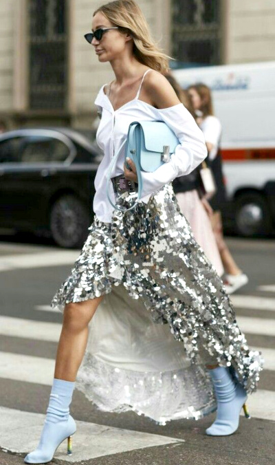 Pour ma part, j'ai une jupe droite à sequins réversibles doré/noir, je la porte qu'en journée, au boulot, avec un gros pull et une paire de basket.