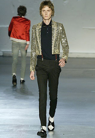 Quand Hedi Slimane évoque une décennie (ou un style), il convoque sans aucun état d'âme toutes les pièces fortes ayant servi cette dernière, au risque de paraître légèrement premier degré. C'est ainsi qu'en choisissant cette saison de se référer aux années 2000, il exhume sans surprise les fameuses bottes biker de l'époque (dont la largeur accentue l'effet "brindille" du skinny), les tops et robes en crochet rappelant l'âge d'or de Coachella, la veste officier esprit Pete Doherty, le glitter grunge à la Kate Moss, la veste militaire oversize ou encore le porté du sac à main au creux de la saignée du coude…