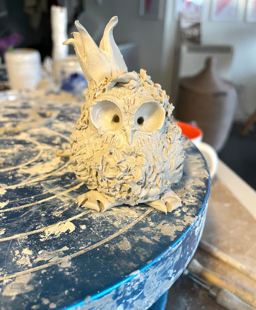 Pressée, lissée, creusée… sous mes doigts la terre se laisse faire. Docile, elle prend rapidement la forme de ce qui volette sous mon crâne, de ce qui fait palpiter mon monde imaginaire. De masse froide, elle devient créature. De matière inanimée, elle mute en tendre bestiole. De rien, elle devient moi. De rien, je deviens elle…
