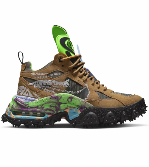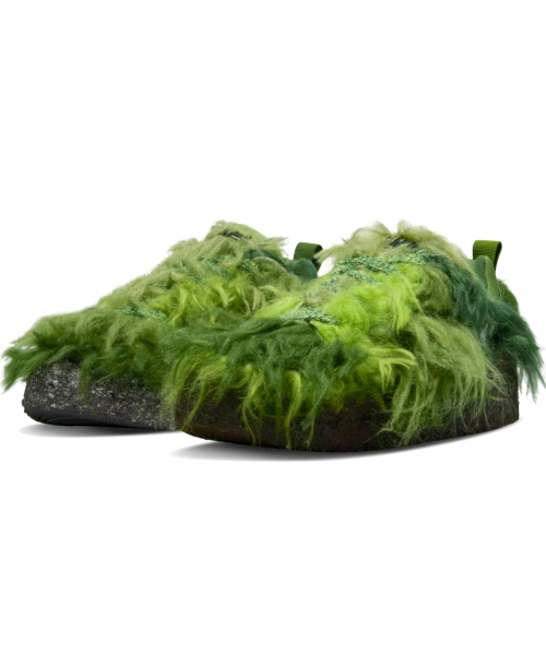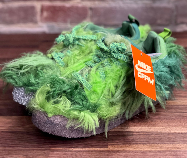 Lorsque Cactus Plant Flea Market (une marque créée par l'ex-styliste de Pharrell Williams) s'empare d'un modèle Nike, le résultat est souvent impactant ; on pense tout particulièrement aux Air Vapormax 2019 au logo tuyauté ainsi qu'aux Nike Dunk Low Pure Platinum strassés. Cette saison, c'est en hommage au personnage poilu et verdâtre du Grinch que Nike et CPFM imaginent une basket hirsute (voir ici et là), qui n'est pas sans évoquer le pelage d'un Furby oublié dans une benne à ordures…