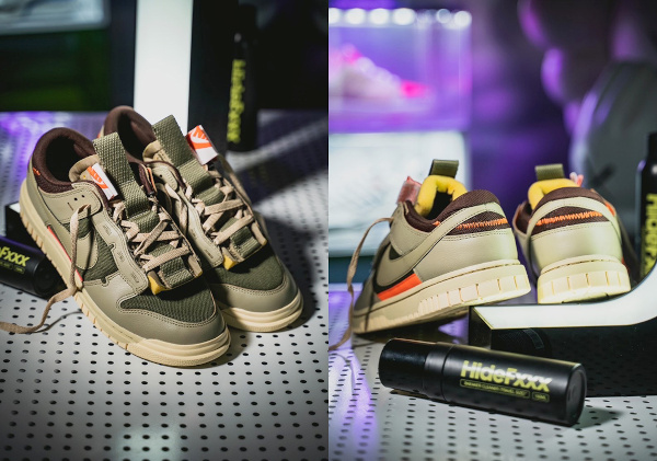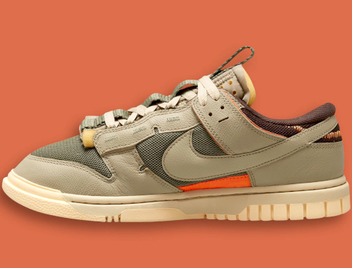 En déconstruisant la forme originale de la Dunk Low (1985) tout en maintenant son allure générale, Nike parvient à lui insuffler une nouvelle désirabilité. Dans la pratique, certains empiècements de cuir cèdent la place au mesh, la languette se voit doublée de mousse apparente et le tout gagne en confort. Sans parler du mix kaki/lichen/touche d'orange qui fonctionne ici à merveille.