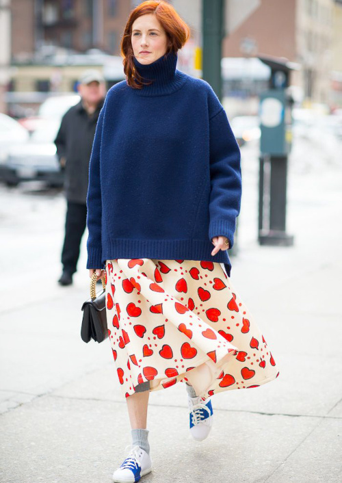 Le duo gros pull/jupe ample midi. Le sac structuré visant à contrebalancer l'ampleur molle du look. Le fait de préférer le mix jupe/baskets au duo jupe/souliers féminins.