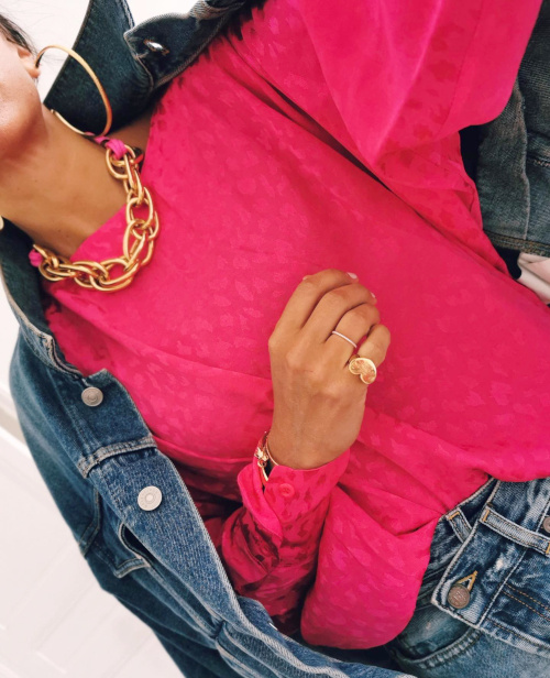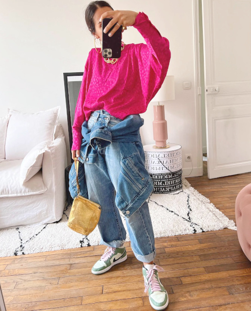 Le mix rose pimpant/jean délavé. Le mariage entre un top plutôt habillé et un jean clairement décontracté. Des cheveux attachés chicisant une silhouette à l'énergie nonchalante.