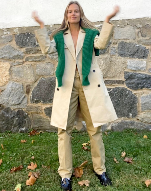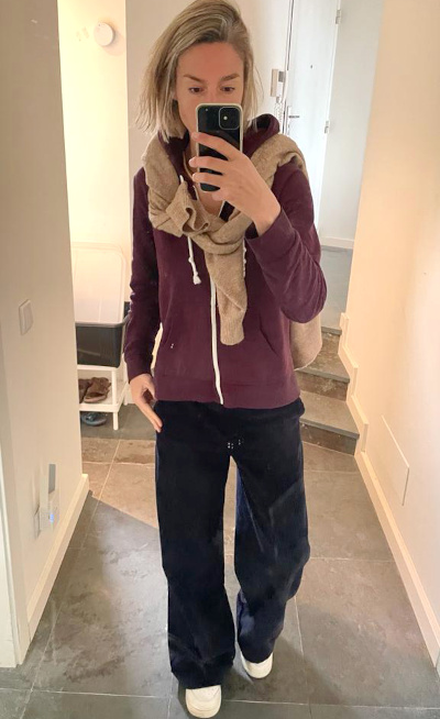 La matière du sweat aurait gagné à être plus noble. Le choix d'un coton bien épais aurait en effet offert plus de densité à la tenue. La laine du gilet noué sur les épaules manque de moelleux, si bien que le nouage des manches fait brouillon. Un pull ou un gilet en grosse maille (ou en cachemire) aurait été plus flatteur. Quelques fines bagues ou une grosse chevalière vintage auraient permis de twister un ensemble très casualwear. Accrocher des photos au mur.