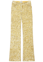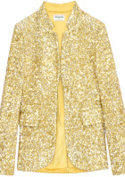 L'idée est ici d'offrir une caution masculine aux sequins dorés (très connotés "festivités de fin d'année") en les choisissant brodés sur une pièce boyish, mais aussi de calmer le côté disco du costume glitter en en lui associant du très casual via le duo tee-shirt blanc/baskets blanches. On évitera les bijoux, le costume se suffisant à lui-même. On relèvera nos cheveux en chignon haut, puis on placera le chouchou vert d'eau autour dudit chignon (en hommage aux années 90).