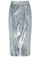 L'idée est ici est d'adoucir la dimension glamour des reflets argentés de la jupe en lui mariant un tee-shirt appartenant à la famille des basiques, mais aussi de jouer avec le duo rouge/rose en misant sur des accessoires funky/chic. On glissera le tee-shirt (que l'on veillera à prendre relativement ample) sur le devant de la jupe. On placera la barrette sur le côté d'un chignon bas.