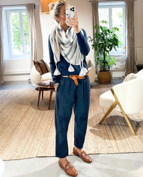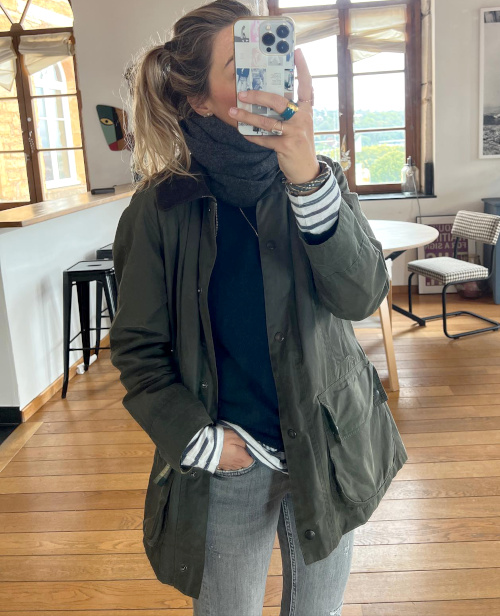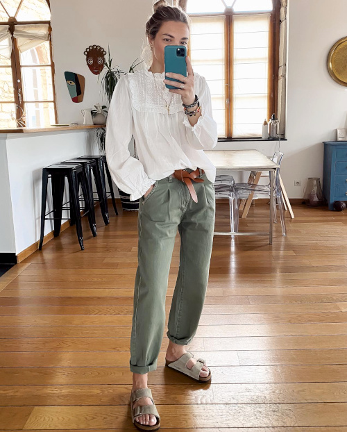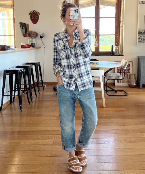 Traiter la chemise d'homme à carreaux avec désinvolture (voir ici). Accompagner ses pièces les plus fortes d'un basique tout-terrain (voir ici). Quand la saison le permet, porter ses pantalons de velours avec des sandales plates épurées (voir ici). Insérer un foulard esprit keffieh au sein de ses tenues les plus classiques (voir ici). Laisser les manches de sa marinière dépasser de celles de son pull (voir ici). Miser sur une ceinture minimaliste de caractère pour twister le trio blouse blanche/chino kaki/Birkenstock (voir ici). Opter pour une chemise à carreaux bûcheron plus étroite que ample afin de ne pas surjouer le côté "Grand Nord" et de pouvoir ainsi l'associer à un jean boyfriend et à une paire de Birkenstock fourrées (voir ici). Densifier le combo bleu marine/vert forêt en lui associant un accessoire dont les motifs reprennent la même charte chromatique (voir ici). Porter le sac banane en bandoulière sur un pull étroit (voir ici). Faire du vert et de ses différentes nuances une gourmandise stylistique (voir ici et là).