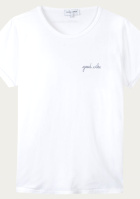 Faire blouser le tee-shirt dans le jean. Jouer sur le style 90's du look en retenant ses cheveux dans une pince crocodile rose. Réchauffer le look avec une maxi écharpe violette.