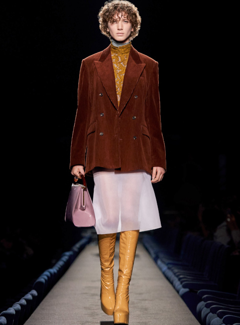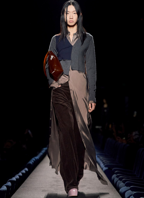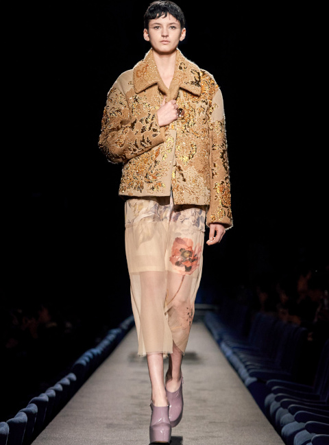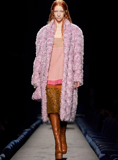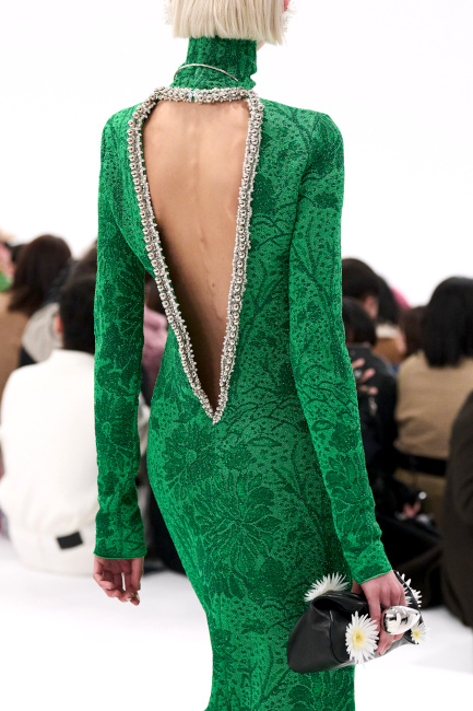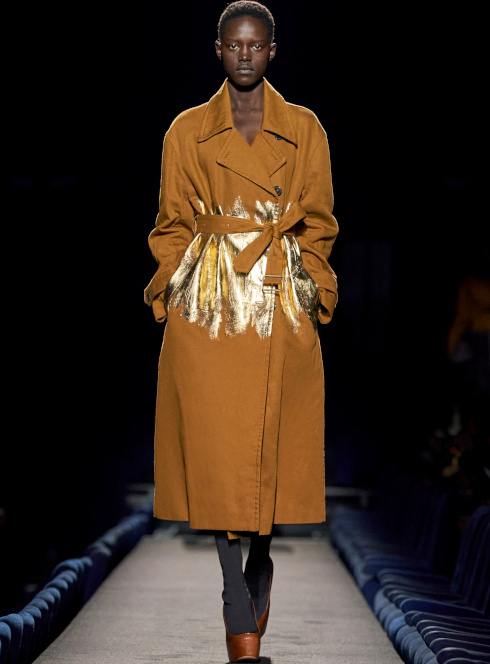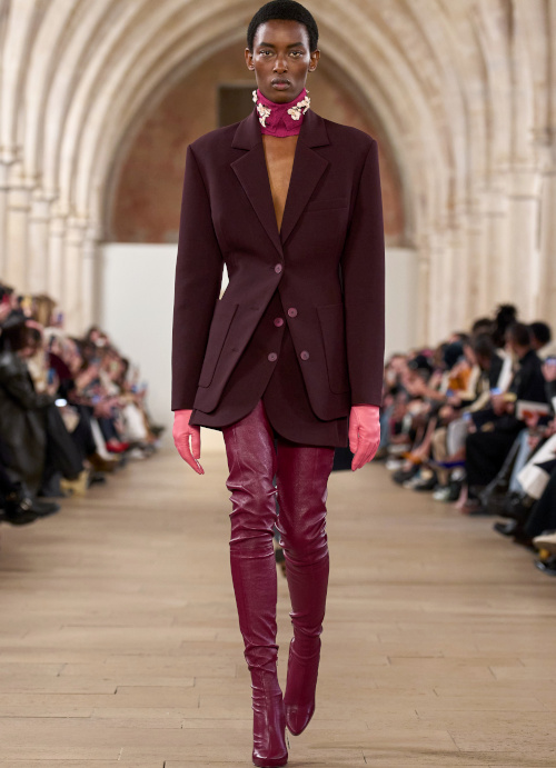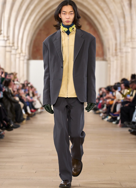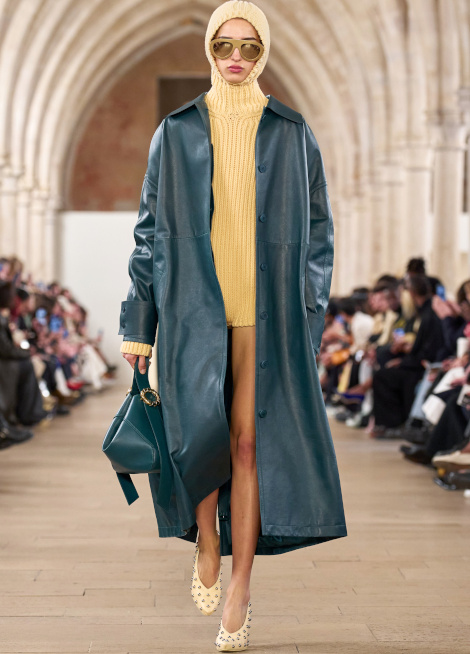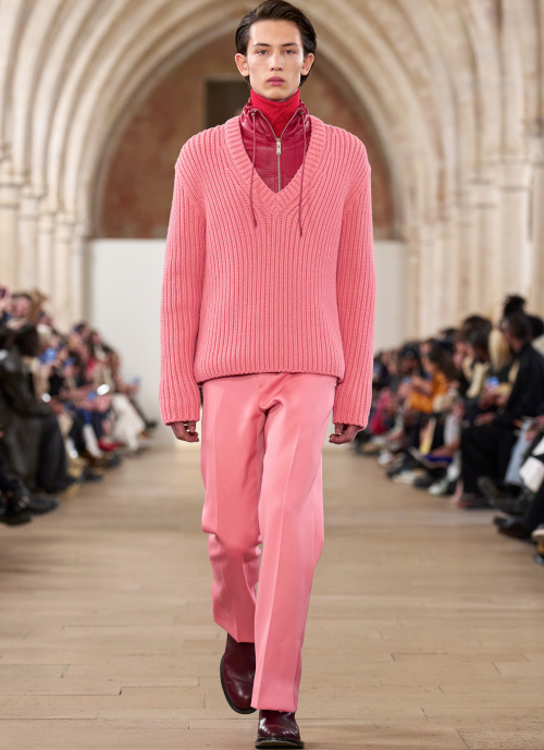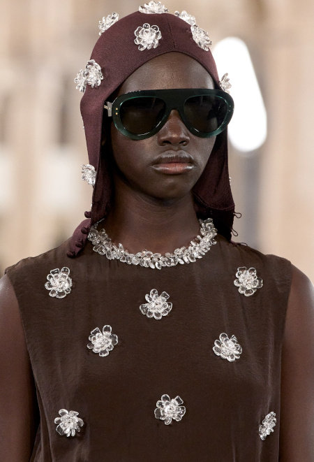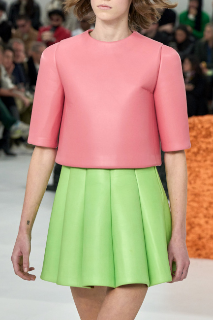 En boudant les rouges vibrants et les roses shocking au profit de teintes plus subtiles telles que le lie de vin, le bordeaux, le framboise ou le rose bubble gum, Bruno Sialelli offre une nouvelle subtilité au traditionnel duo rose/rouge (voir ici et là). Les inspirations moyenâgeuses issues du film "Perceval le Gallois" d'Éric Rohmer se manifestent notamment via des cagoules et des capuches. Espérons que ces dernières resteront cantonnées aux podiums et ne descendront pas dans la rue… (voir ici, ici et là) Également vues chez Prada, les fleurs en 3D pourraient bien s'imposer comme l'une des coquetteries de la saison (voir ici). Lorsqu'il se voit marié à un bleu canard profond, le jaune gagne en sophistication (voir ici).
