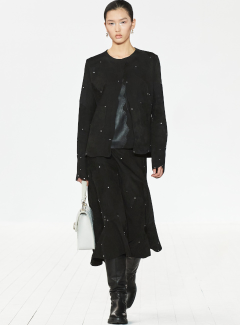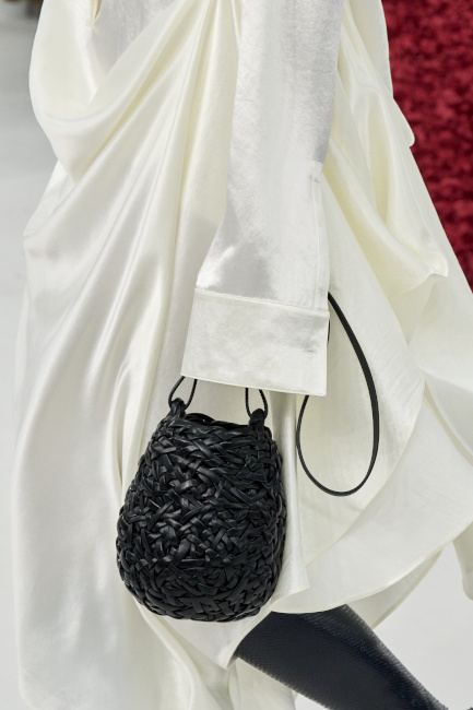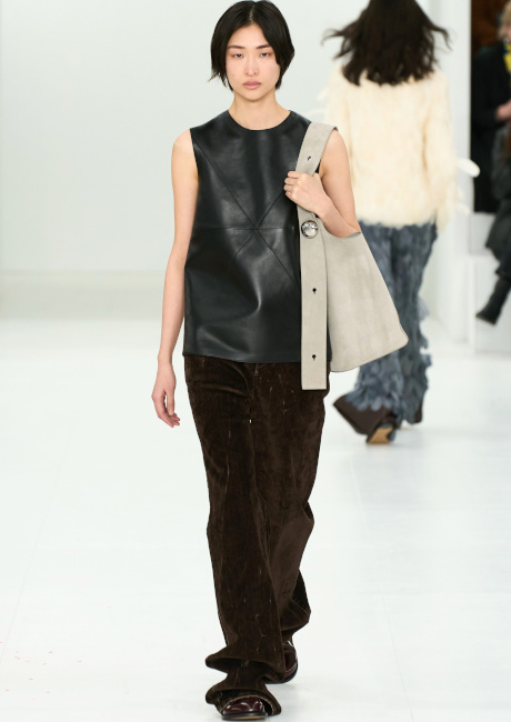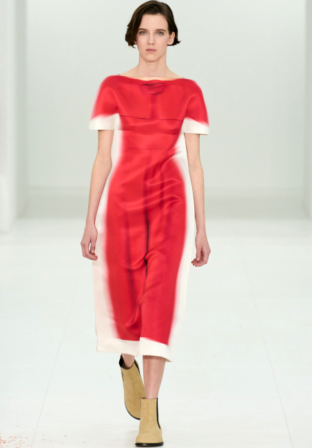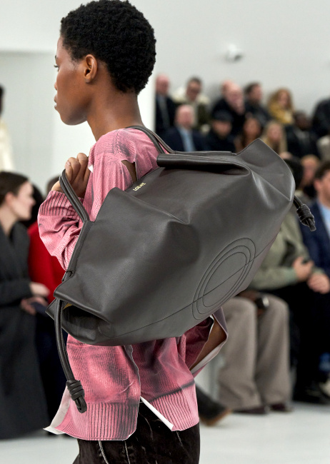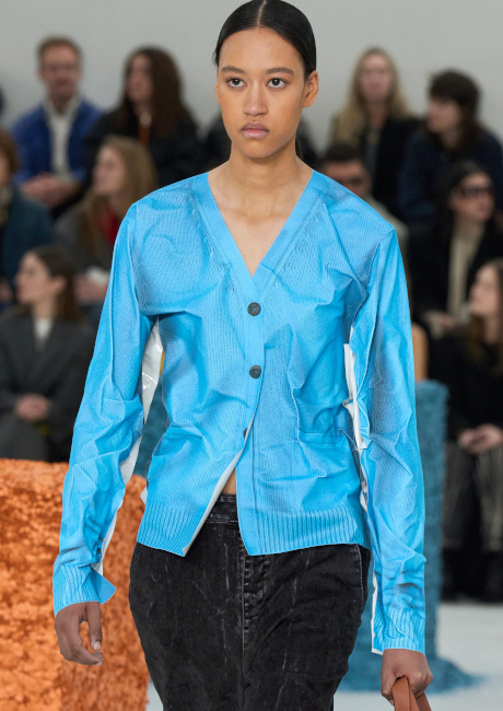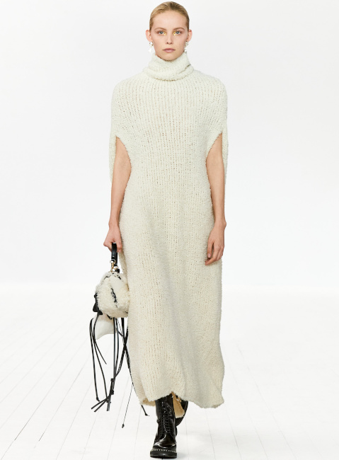 Que voyons-nous réellement lorsque l'on observe une image en deux dimensions ? C'est la question que l'on ne cesse de se poser en visionnant la nouvelle collection JW Anderson. Cette robe est-elle plate ? La laine de ce cardigan est-elle réelle ? Est-ce une robe ou un sac, ou bien les deux ? Cette matière est-elle rigide ? Est-ce que je vois flou ? Autant d'interrogations générées par un vestiaire espiègle où les trompe-l'oeil interrogent notre rapport aux visuels diffusés sur internet. La fantaisie de JW Anderson n'a cependant de valeur sur le plan commercial que parce que le designer est également capable de produire des pièces aussi fortes que portables (voir ici, ici et là) dont la fausse simplicité ravit les clients de la griffe. Sans parler bien entendu de la maroquinerie qui, entre excellence et originalité, fait de Loewe une griffe incontournable dans le secteur du sac de luxe (voir ici, ici et là).
