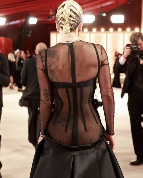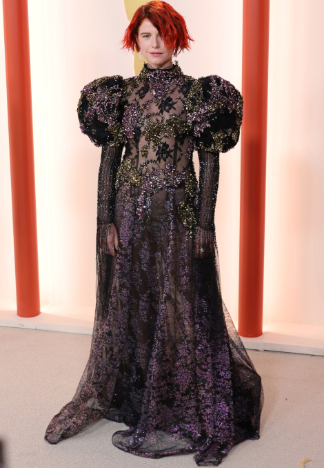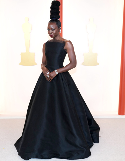 Élégante, gracieuse et humblement sûre d'elle-même, Michelle Yeoh - qui décrocha l'Oscar de la meilleure actrice - peut se targuer d'avoir su choisir une robe (Dior) célébrant avec justesse sa douceur raffinée (voir ici et là). Si la tenue Louis Vuitton de Cate Blanchett ne démérite pas, on regrette néanmoins que l'actrice n'ait pas proposé quelque chose de plus enthousiasmant (voir ici). Jamie Lee Curtis a beau apparaître particulièrement sculpturale, les baleines fictives de sa robe Dolce & Gabbana n'en ressemblent pas moins à une gaine en voie de déliquescence (voir ici). Le syndrome "Scarlett O'Hara" fut diagnostiqué chez bon nombre d'invitées à la célèbre cérémonie hollywoodienne : de Florence Pugh à Elizabeth Banks en passant par Cara Delevingne, Fan Bingbing et Stephanie Hsu, toutes donnèrent l'impression d'avoir taillé leur toilette dans les rideaux de leur riche demeure... Mêlant coupe banalement sobre et traîne évoquant la dépouille d'un corbeau piñata, la robe Prada arborée par Hong Chau ne rend hommage ni la fraîcheur de l'actrice, ni à la maison italienne. Si le mix "coupe courte + fourreau partiellement argenté + cape translucide brodée de diamants" fonctionne parfaitement sur le papier, force est de constater que dans la pratique, le manque d'espièglerie de ladite coupe et la dégaine de vestale aseptisée de l'ensemble Chanel diffusent sur l'ensemble de la silhouette une aura soporifique. Dommage, surtout lorsque l'on se souvient de l'opus 2017 qui avait vu apparaître sur son tapis rouge une Michelle Williams à la simplicité mutine… Lady Gaga attira l'attention en portant une robe Versace dévoilée quelques jours auparavant lors du défilé A/H de la griffe. Une toilette très Mireille Darc… Pour autant, ce n'est pas l'audacieuse coupe de la robe de la jeune femme que l'on retiendra, mais plutôt son empressement non feint à se porter au secours d'un photographe qu'elle fit trébucher un instant plus tôt. Plus que jamais symbole du "girl power", l'imagerie de la sorcière semble avoir inspiré aussi bien Jessie Buckley que Molly Sims, qui semblent toutes deux en partance pour le casting d'Hocus Pocus… Nicole Kidman a apparemment trouvé la localisation de la fontaine de Jouvence… (voir ici) Ce n'est pas parce que le tapis rouge s'est mué en moquette beige que le port de l'orange se révèle plus aisé. Qu'il s'agisse du mix orange/noir (trop premier degré), du duo orange/sequins (trop déguisement) ou de l'ensemble orange/coupe glamour (trop alambiqué), cette couleur - qui lorsqu'elle est bien maîtrisée peut faire des merveilles au sein d'un look prêt-à-porter - n'est pas parvenue à briller en mode "soir". Kate Hudson semble bien s'amuser et c'est tout ce qui compte (voir ici). Le glamour hollywoodien et subtilement rétro émanant de l'allure globale de Jessica Chastain s'avère presque trop parfait pour être séduisant (voir ici). Si le mieux est l'ennemi du bien, le trop échancré est quant à lui l'ennemi de l'allure, comme nous le prouve - à ses dépens - Halle Berry (voir ici). Une robe devrait être pensée pour être seyante en mouvement… (Ana de Armas en Louis Vuitton) Le duo col montant/manches longues remporte l'Oscar du tandem stylistique à éviter absolument sur les tapis rouges/beiges (Melissa McCarthy et Karen Murphy). Le regard de Colin Farrell lancé à son fils de 13 ans nous rend l'acteur particulièrement sympathique (voir ici). Si l'esprit "Jane Austen" de la robe Alexander McQueen de Rooney Mara ne manque pas de charme, la traîne de cette dernière - qui semble retenue par un élastique attaché à la va-vite - laisse songeur (voir ici). Alors que Rihanna n'en finit pas de décliner le concept de "future maman sexy", on regrette que celle-ci ne ne parvienne pas à insuffler un brin de subtilité à l'exercice (voir ici et là). À la fois classique et intemporelle, la robe portée par Danai Gurirar et imaginée par Jason Wu fut l'une des belles surprises de la soirée. On est par contre moins convaincu - sur le plan esthétique - par la coiffure de l'actrice rendant hommage "aux femmes africaines portant des objets sur leur tête". Les futures mariées devraient trouver de quoi s'inspirer au sein de la revue de looks de cette cérémonie des Oscars, tant on eut parfois l'impression d'assister à un défilé Pronuptia (voir ici, ici, ici et là). La toilette Moschino d'Angela Bassett n'est pas sans évoquer l'emballage "artistique" réalisé par certains fleuristes pour finaliser leurs bouquets... En entravant les mouvements de Jennifer Connelly, le fourreau conçu par Nicolas Ghesquière fige l'actrice dans une posture froide et empruntée.