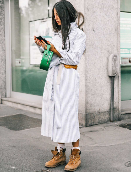 L'association entre cuir fauve et fines rayures verticales bleu clair/blanc se révèle aussi fraîche que chaleureuse. Le choix de la robe chemise permet de conjuguer la notion de féminité sur une note subtilement unisexe. Sur le papier, l'idée du télescopage entre robe et boots utilitaires est souvent une bonne idée. Les mollets nus permettent d'aérer la silhouette.