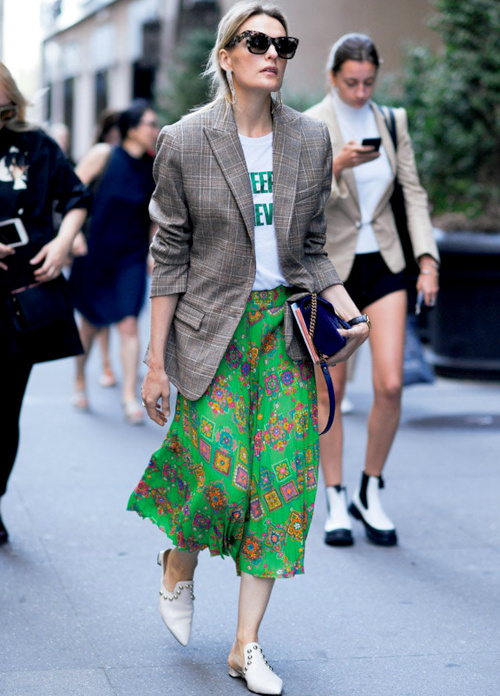 La mise en présence d'univers différents - entre veste masculine, tee-shirt casual fantaisie et jupe hippisante - crée un puzzle vestimentaire plaisant. La présence d'une même couleur (ici le vert) sur deux pièces différentes permet de générer une nécessaire unité au sein d'un look basé sur le télescopage de styles. Le fait de dévoiler les avant-bras en retroussant les manches du blazer permet de faire respirer le haut de la tenue.