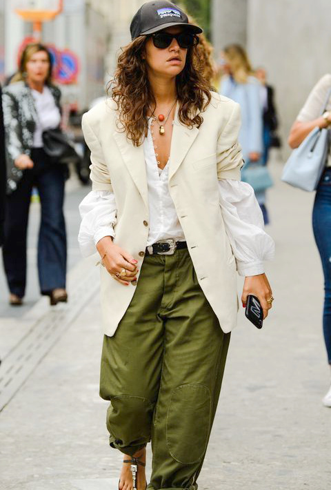 Entre le ceinturon western et la blouse romantique, il aurait fallu choisir. Le retroussage des manches du blazer sur celles bouffantes de la blouse génère un effet plus étrange que joliment original. Un blazer sans manches aurait de toute évidence mieux servi cette blouse, tandis qu'une chemise blanche classique aurait mieux fonctionné avec le blazer présent sur la photo. Le port de la casquette sur une chevelure densément bouclée est risqué, l'effet "cocker" n'étant jamais loin. Un chignon bas flou ou une queue basse sur le côté sont autant d'options capillaires moins périlleuses pour allier casquette et boucles.