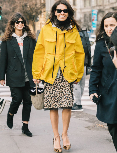 Mêler des éléments emblématiques de styles extrêmement différents (ici jupe léopard/glamour sexy et ciré jaune/utilitaire) permet de provoquer des cadavres exquis stylistiques visuellement impactants. Le contraste entre la cosyness du haut du look et la sophistication du bas offre à la silhouette une intéressante saveur hybride. Le sourire de l'intéressée injecte une énergie lumineuse non négligeable à l'ensemble.