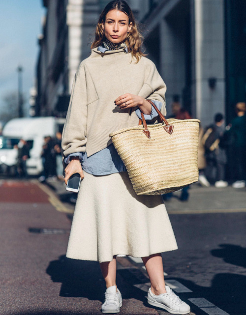 Travaillé sur des volumes plus minimalistes/cosy que classiques, le camaïeu de teintes beige/blanc cassé se fait plus doux qu'ennuyeux. Les mollets nus allègent l'ensemble de la silhouette. L'insertion d'une ample jupe midi au sein d'une tenue casual permet à cette dernière d'éviter le no look.