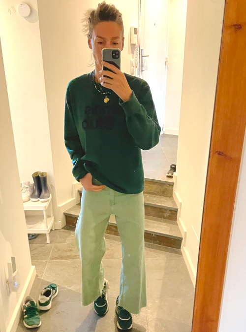 Le camaïeu de verts permet d'extraire la tenue du no look. Les colliers dorés boostent le vert bouteille du sweat.