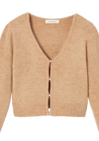 Porter le cardigan déboutonné. Remplacer au besoin la blouse par un modèle non cropped. Resserrer légèrement le bas du pantalon. Opter pour des cheveux lâchés esprit "je viens de sortir de mon lit".
