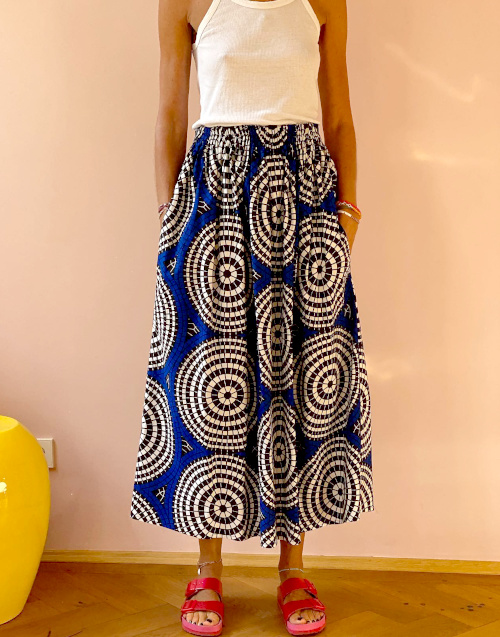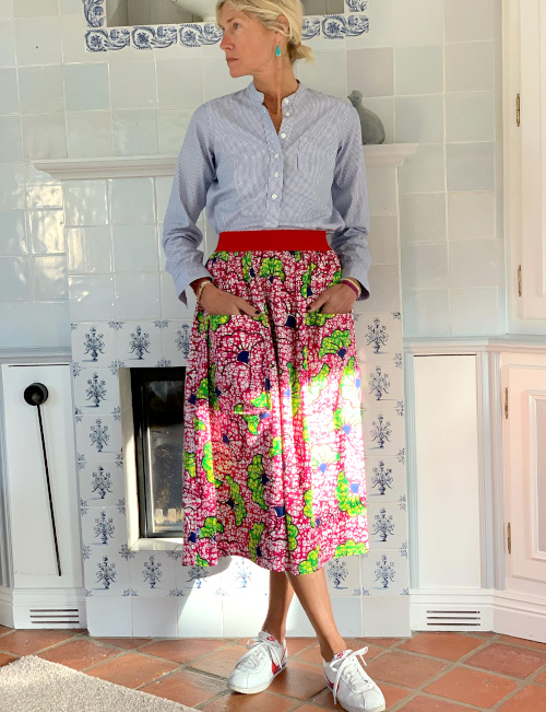 Décidément, la chemise bleue à rayures avec jupe imprimé fou, wax ou fleurs c'est top.