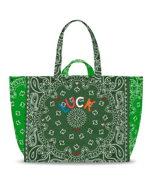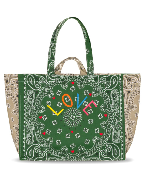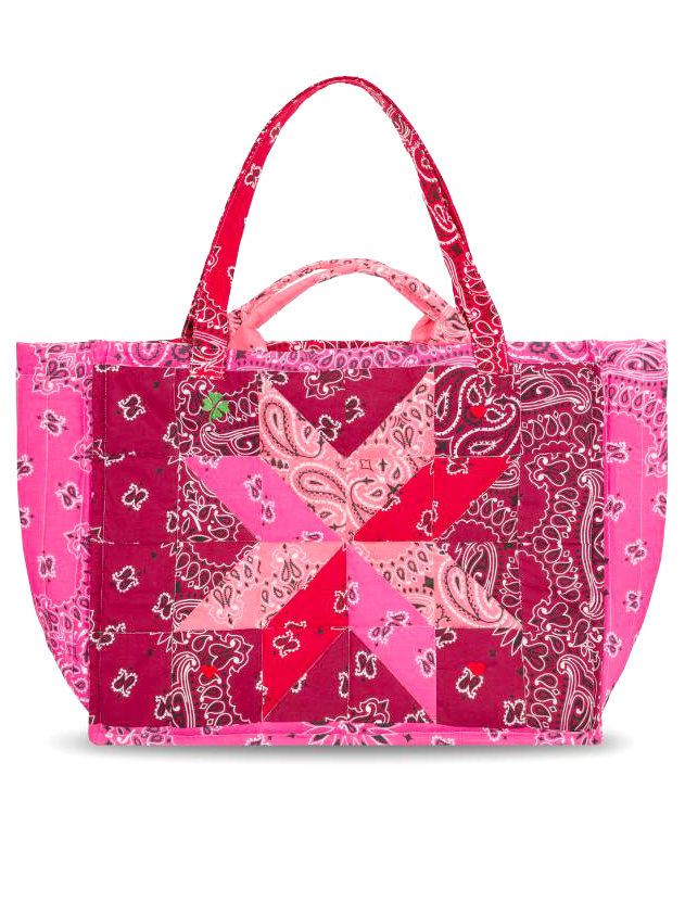 La technique du patchwork donne ici naissance à des puzzles chromatiques qui, entre télescopages et camaïeux, créent des accessoires capables de dynamiter la torpeur des looks les plus simples. On imagine ainsi sans mal , le combo marcel lichen / ou encore le duo / tee-shirt blanc loose être intensément revitalisés par ce cabas aux diverses nuances de rose. En associant deux éléments graphiques au style opposé - des lignes courbes et déliées pour le motif Paisley et une écriture sobre pour les inscriptions - la créatrice crée un mariage inattendu au résultat aussi espiègle que chaleureux (voir ici et là). La possibilité de faire broder son cabas ou son bandana avec l'inscription de son choix permet d'éviter de sombrer dans les lieux communs du vocabulaire "peace and love" surexploité par le prêt-à-porter. À nous ainsi les mots codés, les coordonnées géographiques de notre premier baiser ou encore les titres de romans ayant bouleversé notre jeunesse… L'offre de Colombe Campana n'est pas forcément vouée à susciter un achat : elle peut également nous donner envie de nous lancer à notre tour dans la confection d'un cabas que l'on brodera à nos heures perdues…