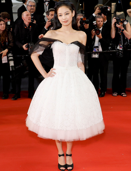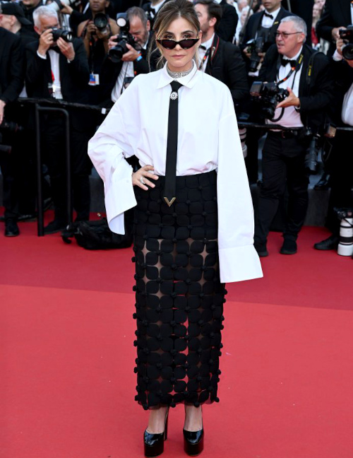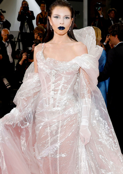 Si les robes Dior de Jennifer Lawrence (voir ici et là) manquaient de ce petit twist capable de transformer une tenue d'apparat en moment de mode inoubliable, on salue néanmoins la fraîcheur de la jeune femme qui n'a pas hésité - après la projection du documentaire "Bread and Roses" - à chausser une paire de tongs pour descendre les marches du Palais des festivals. Évoquant tant la douceur espiègle que la sophistication d'une illustration de Paul Iribe, la tenue Louis Vuitton d'Alicia Vikander frôle le sans-faute. On regrette simplement que l'effet ton sur ton - entre l'étoffe de la robe et la peau de la jeune femme - ait tendance à affadir l'ensemble. La chanteuse sud-coréenne Jennie a trouvé chez Chanel de quoi upgrader le style cosplay en optant pour des toilettes revisitant avec un certain chic le personnage de la soubrette (voir ici et là). Bien décidée à ne pas passer inaperçue, Léna Mahfouf prit le pari - risqué - de se glisser au sein de robes s'inspirant de celles ayant sublimé par le passé tops models, actrices et chanteuses. On put ainsi apercevoir l'influenceuse tour à tour dans une toilette Vivienne Westwood évoquant celle portée en 1994 par Naomi Campbell, dans une robe Versace rappelant celle arborée par Jennifer Lopez lors des Grammy Awards 2000 ou encore "vêtue" du fameux g-string de Gucci (1997). Difficile de croire que la seule manière de maintenir en place un bustier soit de choisir ses balconnets en taille XXS… (Leonie Hanne en Georges Hobeika) En insufflant à ses toilettes griffées un peu de sa coquetterie rock, Lily Depp pourrait bien parvenir à nous réconcilier avec la maison Chanel (voir ici et là). On regrette cependant que la fille de Vanessa Paradis ait misé sur le duo collants/gants en voile noir semi-transparent (l'intérêt stylistique de ce dernier était encore à démontrer) pour réchauffer une tenue qui n'en avait pas besoin (voir ici). L'abus de taffetas (tout Balenciaga soit-il) peut malheureusement - par son premier degré "cocktail" et son manque de légèreté - gommer le charme de celles qui s'y adonnent (voir ici). Gênantes, voire grotesques, les tenues de Julia Fox brillent par leurs vibrations étranges où se mêlent sensualité malsaine et désir primal d'attirer l'attention (voir ici et là).