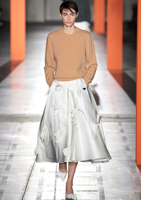 En choisissant d'associer l'une des pièces les plus basiques de la garde-robe unisexe (le pull gris anthracite) avec la sophistication contemporaine d'une jupe droite mi-mollet ornée de fleurs en 3D, Miuccia Prada donne naissance à une silhouette s'autoéquilibrant : l'austérité de la maille grise se dissout au contact de détails dignes d'une robe de mariée, tandis que ces derniers perdent en premier degré.