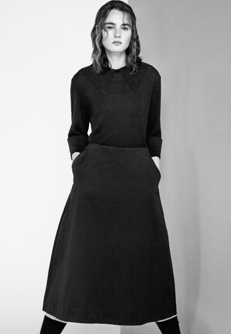 On retiendra l'idée du pull sage col rond de couleur classique (gris, bleu marine ou camel) à associer à une jupe blanche midi dotée d'un twist (texture intéressante, jeux de matières…). De nombreuses jupes estivales pourront ainsi être réutilisées pendant la saison automnale. Attention cependant : sans twist et décliné dans des teintes sombres, ce combo risque de perdre tout intérêt (Margaret Howell).