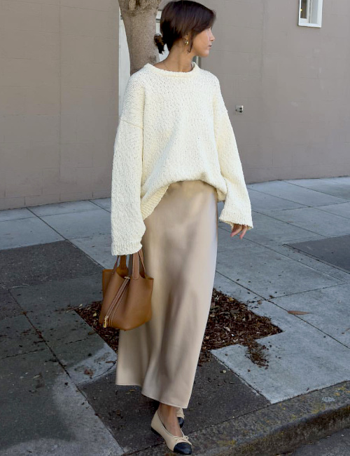 Donc : avoir une grande jupe à godets d'hiver, porter mes bottes hautes noires avec mon manteau long, porter le hoodie sous le manteau court. Quoi donc : sequins et pull.